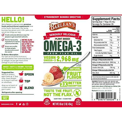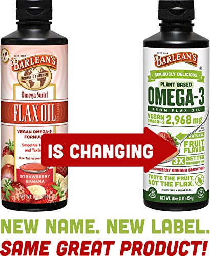 . Más información del producto Barlean's Omega Swirl Flax Oil Taste the Fruit, Not the Oil. Ampliar Leer más Barlean's Omega Swirl Flax Oil Ampliar Good to Know Non-GMO Gluten Free Vegan Kosher No Artificial Flavors or Colors Purity Guaranteed No Fish Burps No Added Sugar - sweetened with Xylitol 3X more absorbable than standard fish oil Enjoy right off the spoon, mix into a smoothie or use as a topping. Vegan Omega-3 Formula Seriously Delicious Strawberry Banana The creamy texture and delicious taste of our Swirls means even kids will ask for their fish oil. Emulsified to make the Omega-3s more bioavailable (absorbable) to your body = no fish burps. Sweetened naturally with Xylitol. More than 2,900mg of vegan Omega-3 per serving Available in 8-ounce or 16-ounce. Leer más Good to Know Highlights Leer más You Have Options Ampliar Ampliar Ampliar Omega Swirl Flax Oil, Blackberry 8-ounce or 16-ounce. Specialty Swirls in Three Flavors Island Fruit, Fresh Apple (vegan), Coconut (vegan). Blended Oils in Three Flavors Chocolate Mint, Orange Cream, Pomegranate Blueberry. Leer más How do you take your Omega Swirl? Mix it into your afternoon smoothie. How do you take your Omega Swirl? Drizzle over your morning yogurt. How do you take your Omega Swirl? Freeze it in a popsicle for a summer treat. How do you take your Omega Swirl? Mix it into your afternoon smoothie. mix drizzle freeze spoon . Descripción del producto Descripción del producto . Amazon.com An easy and delicious way for the whole family to enjoy the benefits of omega-3 fatty acids, Barlean's Organic Oils Omega Swirl Flax Oil has the taste and texture of a fruit smoothie. Made with Barlean's 100-percent organic and vegetarian, cold-pressed flax oil, this supplement provides 2,620 milligrams of omega-3s per serving to provide overall health, wellness, and support to the body's systems. It's also fresh and great tasting with a sugar-free, fresh and fruity strawberry-banana flavor kids and adults will enjoy. Omega Swirl Flax Oil can be taken straight from the bottle, or added to juice, yogurt, or blended beverages.Organic Oils Omega Swirl Flax Oil, Strawberry Banana At a Glance:Flaxseed oil without the oily taste and texture of capsules Naturally sweetened with xylitol Made to order and dated for optimum freshness Contains 2,620 milligrams of LNA per serving 100-percent guaranteed Enjoy all the benefits of omega-3 fatty acids with the taste and texture of a fruit smoothie. View larger.All-Natural, Great-Tasting Source of Omega-3s for the Whole Family Specially designed for the whole family, including kids who are fussy about the taste and texture of liquid oils or difficult-to-swallow capsules, Barlean's Organic Oils Omega Swirl Flax Oil makes it easy to enjoy the benefits of omega-3 fatty acids. Naturally sweetened with xylitol, the blend of purified flaxseed oil has a fresh, fruity flavor. Each 2-teaspoon serving provides 2,620 milligrams of omega-3 fatty acids, 760 milligrams of omega-6 fatty acids, and 850 milligrams of omega-9 fatty acids.This balance of omega fatty acids can positively affect the structure and function of the cardiovascular system, and body systems related to pain, inflammation, and immune response.About Flax Seed Oil Flax is a plant with seeds filled with flaxseed oil, which contains more than twice as much omega-3 oil as fish oils. Several studies have validated the use of essential fatty acids, such as omega-3s in fish and flaxseed oils, in relieving joint discomfort and mobility. Fatty acids can also help support healthy bone density, energy endurance, a healthy cardiovascular system, and cholesterol levels. There is also evidence to suggest that flaxseed oil can promote IQ, improve behavior, and enhance focus in children.About Omega-3s Generally, people receive adequate amounts of the omega-6 fatty acids, but their diets often lack in omega-3 fatty acids. The average American's diet--which is often filled with fast foods and prepackaged meals containing high amounts of saturated fat, cholesterol, and trans fats--causes cell membranes to become stiff. This is in stark contrast to the healthy, fluid membranes of a person consuming optimal levels of omega-3 fatty acids, and may compromise overall health and wellness.When it comes to children, learning specialists now believe omega-3 fatty acid deficiency is associated with childhood behavioral problems. Although omega-3 fatty acids are available in some types of seafood such as wild salmon, mackerel, and sardines, many children -and adults who are picky or have dietary restrictions--simply will not consume those species of fish. Flaxseed, which can be inconspicuously incorporated into meals, is a good alternative. Flaxseed oil may be used in baking, salad dressings, and smoothies, as well as many other tasty dishes that the whole family can enjoy. You may even find that Omega Swirl Flax Oil with its fruity taste is easily accepted by your children, either taken straight or drizzled over warm cereals or toast.Barlean's Organic Oils Omega Swirl Flax Oil is backed by Barlean's 100-percent guarantee.What's in the Box One 16-ounce bottle of Barlean's Organic Oils Omega Swirl Flax Oil, Strawberry Banana. Omega Swirl Fish Oil, Lemon Zest Kid's Omega Swirl Fish Oil Lemonade Flavor Mango Peach Omega Swirl Fish Oil Pina Colada Omega Swirl Fish Oil Orange Cream Total Omega Swirl Omega Swirl Flax Oil, Strawberry Banana Total Omega 3-6-9 Vegan Swirl Flax/Borage, Pomegranate Blueberry Essential Woman Omega Swirl Flax/Evening Primrose, Chocolate Raspberry Omega Swirl Flax Oil, Blackberry .