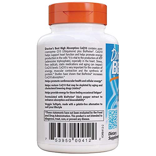 . Más información del producto Leer más *These statements have not been evaluated by the Food and Drug Administration. This product in not intended to diagnose, treat, cure or prevent any disease. **High Absorption CoQ10 with BioPerine Registered. Doctor’s Best High Absorption CoQ10 contains pure coenzyme Q10 (Ubiquinone) plus BioPerine**. CoQ10 helps support heart function and helps promote energy production in the cells.* It is vital to the production of ATP (adenosine triphosphate), especially in the heart. Stress, free radicals, statin medications and aging can impact CoQ10 levels. CoQ10 is very important for the creation of energy, muscular contraction and the synthesis of protein.* Studies have shown that BioPerine** increases CoQ10 absorption.* Leer más What are the benefits from High Absorption CoQ10? - Helps promote cardiovascular health and cellular energy.* - Helps restore CoQ10 that may be depleted by aging and cholesterol lowering drugs (statins).* - Helps provide energy for those feeling occasional fatigue.* Why take High Absorption CoQ10? - CoQ10 is most famous for supporting heart health.* - CoQ10 levels in the heart and body may begin to naturally decline after age 40.* - CoQ10 loss caused by statin drugs and aging may be reversed with CoQ10 supplementation.* - CoQ10 taken with BioPerine** enhances nutrient absorption.* How does it work? - CoQ10 performs two vital functions: It is a coenzyme that helps energize cells and an antioxidant that helps protect cells.* - CoQ10’s energizing antioxidant properties may enhance vitality across many body systems.* - CoQ10 supports brain health, immune performance, skin health, exercise capacity, gum health and more.* - CoQ10 powers this activity by 'sparking' the chemical reactions that energize cardiac tissues.* Leer más Leer más Due to the extraordinary energy requirements of our hardworking heart, the highest concentration of CoQ10 is found in heart muscle tissue. CoQ10 is known to support the heart through mitochondrial bioenergetics, the process of cellular energy transformation. Several studies have highlighted the efficacy of oral CoQ10 in improving functional capacity, endothelial function, and myocardial ventricular contractility in individuals with heart problems.5 On top of this, CoQ10 helps to promote overall cardiovascular health by confronting oxidative stress in heart and endothelial (blood vessel wall) cells.*6-9 CoQ10 has also been shown to modulate oxidation rates of key lipids during supplementation. This type of antioxidant activity may enhance the structural integrity of lipids and supporting healthy blood vessels and circulation, potentially creating a more favorable cardiovascular environment.10. Statins are a class of lipid-lowering medications widely used in modern medicine to reduce cholesterol levels and improve cardiovascular health. Studies have demonstrated that one of the side effects of statins was the lowering body's levels of endogenous CoQ10.11-14 Several studies have demonstrated statin-induced CoQ10 loss may be reversed with CoQ10 supplementation without having an adverse impact on the cholesterol-lowering property of statin drugs.11,15 More, the oral supplementation of CoQ10 could be beneficial in lessening some side effects of statins.*11,16-18. In terms of bioenergetics, CoQ10 supplementation acts to preserve energy turnover in mitochondria—our cellular powerhouses—by keeping ATP synthesis at optimal levels.19 Maintenance of normal energy utilization and supply is crucial for maintaining the cell’s ideal biochemical state. However, this ideal biochemical state may be compromised during the natural course of aging. Although the exact mechanism of the aging process is still unclear, several studies have come to the conclusion that CoQ10 may be involved in age-related alterations of membrane cells and tissues because of its key roles as an electron carrier in mitochondrial bioenergetics and lipophilic antioxidant: CoQ10 deficiency may impair mitochondrial energy production and increase production of reactive oxygen species.20-22 Based on several studies, its natural decline in the aging population may expose individuals to several human ailments.*23. Many studies have suggested CoQ10 supplementation could help preserving energy turnover in mitochondria and consequently maintaining optimum vital functions. CoQ10 oral supplementation is therefore beneficial in supporting healthy aging.*24,25. Human reproductive capacity also declines with age. Several research studies have been conducted to study the connection between oxidative stress and human reproductive health system.26 Male reproductive health is associated with the antioxidant capacity of seminal plasma and the potent antioxidant activity of CoQ10.27-29 The biosynthesis of CoQ10 in testis leads to high levels of its reduced form QH2 (ubiquinol) in semen which indicates a protective role as a scavenger of reactive oxygen species known to impair sperm cell function.*30 In the same way, female reproductive health depends on CoQ10 content in follicular fluid and its relationship with oocyte fertilization.31,32. Pharmacological and Clinical Studies: A prospective randomized double-blind placebo-controlled trial was conducted in 443 participants. The controlled group received a combined oral supplementation of selenium and CoQ10. Results showed that supplementation of selenium/CoQ10 reduced cardiovascular mortality therefore highlighting the positive effect of CoQ10 on cardiovascular health.*33,34 Similar results were obtained from other clinical trials which led also to the conclusion that CoQ10 could potentially enhance cardiovascular health.*35-37. A clinical study investigated the effects of CoQ10 in patients who were on statin therapy. Results showed CoQ10 daily supplementation significantly enhanced antioxidant enzymes activities and lowered inflammatory markers. The research concluded that patients with cardiovascular proble