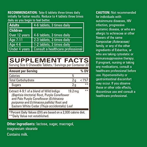 . Más información del producto About Enzymatic Therapy Dedicated to Providing the Best Supplements We want to keep all of our customers knowing, 'What Better Feels Like' through strong leadership, knowledge, and product innovation. Quality is our top priority, with Good Manufacturing Practice (GMP) certifications from a leading agency, and an organically certified, certifed kosher manufacturing facility, we are a pioneer of science-based supplement development with a pharmaceutical-minded commitment to quality. Because everyone's concerns are different, Enzymatic Therapy produces premier supplements that can help support optimum health in a variety of ways from aging gracefully, bone and joint, children's health, cellular Support, detox and cleansing, digestion, energy, heart, immune and respiratory, men's health, women's health and more.* Leer más Ampliar Leer más . Descripción del producto Tamaño:200 Chw Tb enzymatic Terapia, esberitox, Supercharged Equinácea, Inmune, 100 Tabletas masticables .