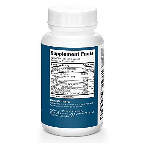 . . Descripción del producto Un sistema respiratorio saludable y pulmones saludables son extremadamente importantes para una vida libre de enfermedades. Dr. Tobias LungMeister es una fórmula respiratoria diseñada específicamente para ayudar a apoyar el sistema respiratorio. LungMeister tiene una increíble mezcla de excelentes ingredientes. Vitamina C. La vitamina C es un nutriente esencial necesario para la salud y el bienestar generales y desempeña un papel vital en el mantenimiento de un sistema respiratorio saludable. - Complejo de bioflavonoide de Citrus. Pensado para mejorar los efectos de la vitamina C en el cuerpo, los bioflavonoides actúan como antioxidantes y están asociados con una serie de beneficios para la salud. - Extracto de corteza de pino. No solo es rico en vitamina C, sino que también contiene potentes antioxidantes llamados polifenoles. Este producto está fabricado con un extracto de corteza de pino que proporciona un contenido mínimo de 95% de polifenoles. El extracto de corteza de pino ayuda a la comodidad respiratoria durante todas las estaciones. Quercetin. Quercetin se cree que proporciona una serie de beneficios para la salud, incluyendo su papel como antioxidante que ayuda a reducir el nivel de radicales libres en el cuerpo. También contribuye a estabilizar las células responsables de la liberación de la istoamina. En general, es ideal para apoyar la salud respiratoria normal. - Bromelain Naturalmente en piñas, la bromelina es una enzima eficaz utilizada para sus beneficios en varias categorías, incluida la salud respiratoria. - Cordyceps Cordyceps ha sido utilizado durante miles de años por los chinos por sus muchos beneficios para la salud. Pensado para ayudar a apoyar el sistema inmunológico, los cayceps también se consideran beneficiosos para los pulmones, riñones y hígado. - Extracto de malla de picado. Beneficioso para apoyar la salud del tracto urinario y la próstata Vitamina K. Una carencia de este nutriente esencial puede dar lugar a una serie de graves problemas de salud. - Extracto Feverfew Los beneficios relajantes de estas hierbas para el tracto respiratorio pueden atribuirse a su contenido de productos químicos naturales, específicamente la partenolida. .