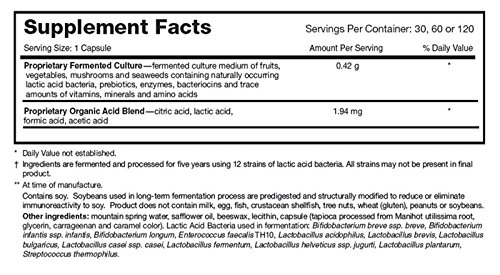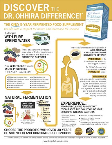 . Descripción del producto With all the probiotic products available, how do you decide which one is the best? Many of these probiotics are new, containing probiotic bacteria which is cultured in a laboratory, freeze-dried and then put in a capsule to take advantage of the current popularity of probiotics. The effectiveness of these new probiotics is often unproven. The selling point becomes CFU count as if that is the most important characteristic. Choose a fermented, whole food supplement that contains Prebiotics, Probiotics and Postbiotic metabolites and which has been crafted for 5 years; clinically studied and supports the rebuilding of your own unique probiotic bacteria and your digestive health. With 70-80 percent of your immune system cells residing in the digestive tract, a healthy microbiome (your own unique combination of probiotic strains) is very important. Probiotic supplements can support those immune cells in your gut. To stay health, scientists estimate that the ratio of good to bad bacteria in your microbiome needs to be at least 85% to 15%. With all the things that affect your gut bacteria, such as stress, diet, toxins in the environment, your lifestyle and antibiotics and other medications, that ratio can be difficult to maintain. Supplementing with a high-quality probiotic can help you maintain the proper ratio. Dr. Ohhira’s Probiotics are a high-quality probiotic supplement that are made differently than any other probiotic and will provide for rapid microbiome repair and ongoing support for a healthy microbiome. The specific combination of pre-biotics, live probiotics and post biotic metabolites is unique to Dr. Ohhira’s Probiotics and can help to rapidly restore digestive balance and promote overall immune health. The unique process that creates Dr. Ohhira’s probiotics starts with pure water and the highest quality fruits, vegetables, mushrooms and seaweed. These ingredients are inspected, prepared and then mixed with the 12 carefully selected strains of probiotics which then goes through a fermentation process based on ancient Japanese techniques. During the fermentation process the probiotic bacteria are strengthened and the result of the fermentation, post-biotic metabolites like organic acids, short-chain fatty acids and trace minerals, are produced and increase in concentration. Every fermentation vat is carefully inspected monthly to confirm the number of bacteria, the viscosity, the purity, the amount of water and other factors are maintained in an appropriate state. The result of this careful crafting is a supplement like no other. Laboratory produced probiotics can't compare. Backed by over 30 years of research and international studies, the unique combination of Prebiotics, Probiotics and Postbiotic Metabolites contained in Dr. Ohhira's shows maximum support for intestinal health and immune response. Organic acids naturally produced by the bacteria help maintain a healthy digestive pH, which benefits hundreds of other beneficial strains in your digestive system -- many strains are unique to the individual. The key benefit that probiotics provide comes from the postbiotic metabolites they produce -- Dr. Ohhira's Probiotics provides such nutrients as short-chain fatty acids and other organic acids (such as acetic, citric, fulvic, humic, and phenyllactic acids), oligosaccharides, polyphenols, melanoidin (anti-oxidant), and trace amounts of chelated minerals, vitamins and amino acids. This is in addition to the Prebiotics (the non-digestible food ingredients) and the Probiotics. All of these ingredients which are unique to Dr. Ohhira’s contribute to what should be one of the main purposes of a probiotic, microbiome repair or improvement.* Choose the premier supplement for supporting digestive and overall health – Award-winning Dr. Ohhira’s Probiotics – the only whole food supplement consisting of concentrated fermented foods containing prebiotics, probiotics and postbiotics. Eating fermented natural food supports your intestinal bacteria. Dr. Ohhira’s unique formula helps you nurture your own unique strains of microbes by creating a good environment for them to thrive. No other probiotic supplement contains this special combination of prebiotics, probiotics and postbiotic compounds.* *These statements have not been evaluated by the Food and Drug Administration. This product is not intended to diagnose, treat, cure, or prevent any disease. Much more than a probiotic. Dr. Ohhira’s Probiotic is an all-natural, SUPERIOR PROBIOTIC developed to support digestive comfort, nutrient absorption and a healthy immune system. Proven effective through over 20 years of use, currently sold in over 15 countries, and backed by over 20 university-based scientific studies. Unlike most other probiotic products, Dr. Ohhira’s Probiotics are not cultured or grown in a laboratory. Ingredients such super-fruits and vegetables – are fermented for five years with 12 distinctive probiotic strains. The longer 5-year fermentation process results in a highly concentrated formula optimized for individuals with complex digestive and immune health goals. Provides live and viable bacteria – NEVER freeze-dried, which have been strengthened through a unique five-year Japanese fermentation process which assures enhanced potency – The five-year fermentation process assures that the strongest bacteria survive. This rich culture medium (PREBIOTICS) from the fermentation process is then encapsulated along with: the Probiotics that have grown together over the five-year period; and the resulting nutrients from this fermentation process (POSTBIOTICS), thus delivering viable probiotics and encouraging your body’s innate ability to grow its own friendly bacteria. When Dr. Ohhira’s Probiotics are encapsulated after 5 years of fermentation, you actually get three products. Each capsule contains multiple strains of probiotic bacteria along with the extensive array of prebiotic
