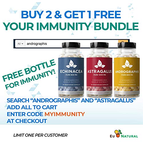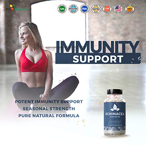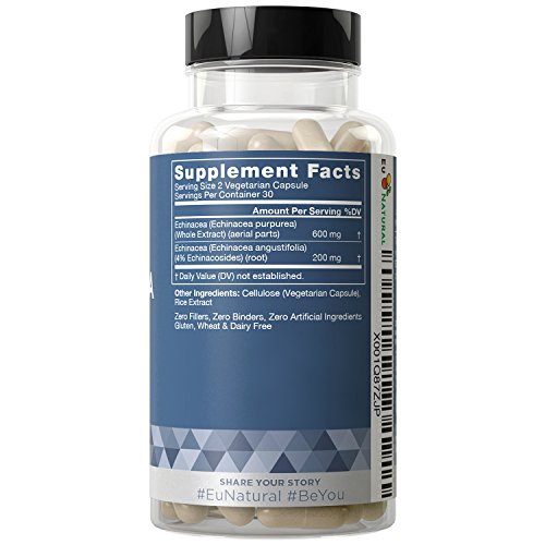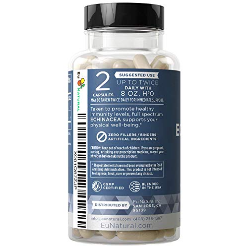 . Descripción del producto ECHINACEA PURE 800 MG - Healthy Immunity Function, Physical Wellness, Potent Strength for Seasonal Protection - Full-Spectrum & Standardized PROBLEM SOLVED! ECHINACEA PURE 800 MG by Eu Natural is the one formula for immunity health, the natural way. Support your wellness using full-spectrum natural ingredients. #1 VOTED! This super ingredient provides you with the best power for seasonal strength. Standardized extracts boost immune response and strengthens your wellness. The powerful combination supports your health from the inside. SEASONAL STRENGTH! Healthy nose, eyes, respiratory and immune system is important year-round. You can have the confidence that every capsule has the strength and potency that you are looking for in a product. VITAMIN ANGELS 1-FOR-1 MATCH! When you buy vitamins from Eu Natural, you aren't just helping yourself, you are also helping a child in need. Your purchase equals one year of life-saving vitamins to children under five, new mothers, and pregnant women who are at risk for malnutrition. EMPOWERING YOUR HEALTH! Eu Natural is cleanest and purest nutrition brand using zero fillers, binders, or artificial ingredients. Strict FDA Standards by cGMP Certified Laboratory. Always gluten, wheat, and dairy free, and never tested on animals. You risk absolutely nothing. We're confident that you will see results and be thrilled with your purchase. Your search for "the ONE" perfect echinacea supplement is finally over! Stack with ASTRAGALUS PURE 1000 MG and ANDROGRAPHIS PURE 800 MG for extra support. Instructions: Take two (2) capsules, up to two times daily with an 8 ounce glass of water. In case of temporary symptoms of nausea, stomach discomfort, or other changes, take only one capsule with food and water. FDA Disclaimer: These statements have not been evaluated by the Food and Drug Administration. This product is not intended to diagnose, treat, cure, or prevent any disease. 100% HAPPINESS & HEALTH We create powerful blends of herbs, vitamins, and minerals, each formulated to promote the best in health. Try our products without worry. We're confident that you will see results and be thrilled with your purchase. THE PURE DIFFERENCE Eu Natural is cleanest and purest nutrition brand using zero fillers, binders, or artificial ingredients. Natural formulas with vegetarian easy-to-swallow soft capsules. Always gluten, wheat, and dairy free, and never tested on animals. VITAMIN ANGELS 1 FOR 1 MATCH When you buy vitamins from Eu Natural, you aren't just helping yourself, you are also helping a child in need. Your purchase equals one year of life-saving vitamins to children under five and new mothers who are at risk for malnutrition. Leer más Leer más . .