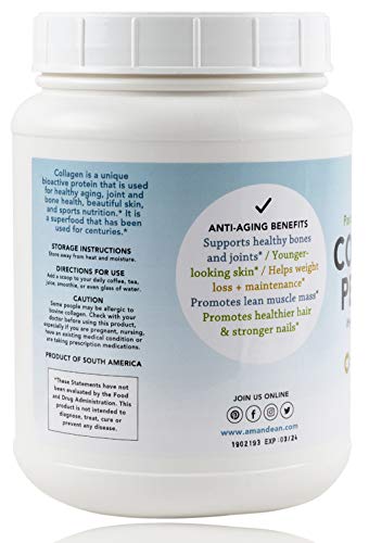 . . Descripción del producto Tamaño:35.2 ounce What is collagen Collagen is the most abundant protein in the body. It is the building material to renew cells in all areas of the body including: hair, skin, nails, eyes, teeth, cartilage, bones, tendons, internal organs, arteries, blood vessels, and the immune system. Collagen accounts for 80% of all connective tissue and 75% of the skin. Why is it needed Collagen production slows down as we age. At age 30 we start to lose over 1.5% of our natural collagen stores each year. By age 40 the body has already lost approximately 15% of its natural collagen. What are the benefits of a collagen supplement The list is long! It helps counteract the effects of aging, like wrinkles, achy joints, muscle loss, a slower metabolism, and a weak immune system. There are 18 amino acids in Amandean Collagen, two of the most prominent are Glycine and Proline. Glycine promotes healthy gut repair and function, as well as more restful sleep. Proline helps tighten skin, repair connective tissue, and supports healthy arterial function. Why Amandean Collagen Peptides - The highest quality collagen sourced from 100% pasture raised grass fed South American cows. Non-GMO, contains no gluten, wheat, corn, eggs, dairy, soy, or yeast. - Rigorously tested for purity and packaged in the USA at a state of the art FDA-cGMP compliant facility. - Tasteless and odorless. We pride ourselves on having the most neutral tasting product on the market and with the best solubility. - A free scoop! - 100% Money back guarantee from a company focused on customer satisfaction and a quality product. Directions for use Add one scoop to your daily coffee, tea, juice, yogurt, smoothie, or even glass of water. Hydrolyzed collagen won’t gel in cold liquids like gelatin will. It is best taken with a source of vitamin C, as it will provide for maximum absorption in the body. .