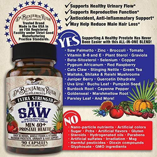 . Descripción del producto PROPRIETARY COMPLEX with "the SAW" Dr. Benjamin Rush brings you the optimal holistic formula pill for superior relief. Our Prostate Supplement has "the Saw”. A Proprietary blend with over 30 Ingredients including Saw Palmetto, Beta-Sitosterol, Selenium, Broccoli, Pumpkin Seed, Stinging Nettle, Tomato, Green Tea, Red Raspberry, Zinc and much more. Saw Palmetto support for the male genitourinary system plus promote healthy prostate function.* Beta Sitosterols & Pygeum are well-researched for their ability to support the prostate gland and optimize urinary flow.* Dr. Benjamin Rush Supplements Prostate Health Support for Men with "the SAW" PROMOTE A HEALTHY PROSTATE Men, why Let your Prostate affect your Quality of Life? Don’t let your Prostate stop you from Biking with the Family, Golfing with your Friends, Long Car Trips, Proper Sleep or Simply going to the Movies. Imagine your day without that Sudden Urge to use the Bathroom. Millions of men have growing concerns about prostate health. Don’t let those frustrating trips to the bathroom get in the way of progress. Get the rest you deserve, and care for your prostate so you can take on the day. ? Support Healthy Urinary Flow* ? Fewer trips to the bathroom* ? Support Better Quality Sleep* ? Support Healthy Prostate Function* ? Over 30 potent ingredients supporting an aging prostate gland* ? Maintaining healthy levels of 5-alpha reductase / DHT can help reduce Male Hair Loss* ? Trusted Brand Made in the USA in an FDA Registered Facility under Strict Good Manufacturing Practice Standards. ? "The Saw" is 100% NON-GMO plus Whole Food ingredients. We appreciate your continued loyalty. Leer más ? Support for a Healthy Prostate Has Never Been Easier with this ALL-IN-ONE Blend! Our Commitment Dr. Benjamin Rush is committed to the best ingredients like Non-GMO, Prime ingredients and all products are made in the USA. Our facility is GMP approved and FDA registered with third party testing. Don't settle for genetically modified ingredients. With the introduction of processed foods and contaminants in the environment, it is vital to give your body the additional nutrients it needs. Your Health It is important that you take care of your aging prostate immediately. Dr. Benjamin Rush brings you the optimal holistic formula pill for superior relief. Try our high quality PREMIUM Probiotics, Turmeric, Omega-3 Fish oil, Prostate Health or Daily Whole Food Multivitamins today. Natural Drug-free Prostate Support NO Nano-particle nutrientsNO GlyphosateNO SugarNO PCB'sNO Harmful pesticidesNO GlutenNO SteriodsNO GMO'sPROUDLY MADE IN THE U.S.ATogether, with your doctors advice, health is not a dream but a reality. Leer más . .