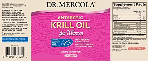 . Descripción del producto Leer más Maximum Female Health Benefits Dr. Mercola Krill Oil, unlike other fish oils, carries Omega 3s, EPA and DHA in the form of Phospholipids. Making them more bioavailable than other forms of fish oil. You get all the necessary supplementation with just 3 capsules per day.* What sets Krill Oil for Women apart is that it’s formulated to maximize benefits for the female body. The addition of Evening Primrose Oil adds Gamma Linolenic Acid (GLA), a vital tool in maintaining optimum feminine health.* Krill Oil for Women has a large number of benefits for the body and mind including: Enhance your brain health with better mood, improved concentration and focus*Assist with hot flashes and other symptoms of menopause*Promote strong cardiovascular and heart health*Improve calcium absorption which can lead to stronger bones*Supports cholesterol and blood pressure levels already in the normal range*Reduce the number of free radicals in your body*Supports healthy and flexible joints* Contains only the purest Antarctic Krill without any filler ingredients. So no more fishy burps or rancid smells when you open the container. Ethical Sourcing Each bottle contains oil from krill (Euphausia Superba) harvested in the pristine waters of Antarctica. Free from the toxins and heavy metals that contaminate the waters of industrial fishing areas. No need to worry about the unsafe accumulation of mercury or other pollutants that can taint the supply of the oil. Our krill are packed full of powerful, health giving nutrients and vitamins. All wild krill harvests are Marine Stewardship Council certified for sustainability - meaning there is no long term impact on krill population numbers. The fishery that supplies Dr. Mercola was the ONLY fishery to receive an A grade for sustainability from the Sustainable Fisheries Partnership - and no other species are captured in their harvesting. And with each capsule in every bottle of Krill Oil for Women, the exact Antarctic GPS location where the krill was harvested is documented. Ensuring traceability and quality. All Dr. Mercola Krill Oil products are manufactured in the United States in a GMP approved facility - ensuring the highest possible quality and safety. Ecologically harvested using the latest marine technology to ensure the krill and other marine species thrive for future generations. A unique capsule system, made with fusion technology ensures no smell. The nitrogen flushed capsules are easy to swallow and free from oxygen keeping them fresh for longer. . .