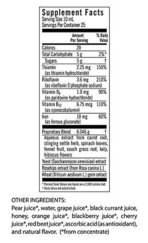 . Más información del producto Leer más Tired Of Being Tired? So was Amanda…until she tried Floradix Iron + Herbs. You can probably relate: between juggling her job and family, she was constantly exhausted. She put off going to the gym and some nights, making dinner seemed like a heroic task. Then she found out she had the most common nutritional deficiency in the US: iron deficiency. Amanda turned to Floradix, an easily absorbed, plant-based, liquid iron supplement that has been helping women reclaim their energy for over 60 years.* Leer más Floradix Liquid Iron Supplement Is A Perfect Choice Why Floradix liquid iron? Floradix is the best selling iron supplement in North America and has been helping women reclaim their energy and vitality for over 60 years.* Its unique low-dose formulation, with highly soluble iron gluconate, as well as whole food concentrates and co-factor B and C vitamins, ensure that it is easily absorbed by the body.* *These statements have not been evaluated by the Food & Drug Administration. This product is not intended to cure, diagnose, treat, or prevent any disease. All Natural Liquid Solution Each 20 mL serving satisfies the RDA for women of childbearing age* Free of alcohol, artificial additives, synthetic preservatives, lactose Packaged in glass bottles Kosher + Non-GMO + Vegetarian + Dairy Free Natural Vitamin C and also B6, B12, B1, and B2 vitamins Leer más Leer más Leer más . Descripción del producto Tamaño:250 ML Su primera opción para la salud, la energía y la Andvitalidad. Floradix contiene una forma fácilmente asimilada de hierro orgánico, extractos de hierbas cuidadosamente seleccionadas, zumos de frutas delicados y vitaminas C y B Complex. Ayuda a utilizar fuentes de alimentos y tiene un papel importante en el mantenimiento de la salud normal y vitalidad. Floradix es especialmente adecuado para mujeres (incluyendo mujeres embarazadas y madres lactantes), niños en crecimiento, adultos, adelgazantes, trabajadores manuales, atletas y en convalecencia. Apto para vegetarianos. .