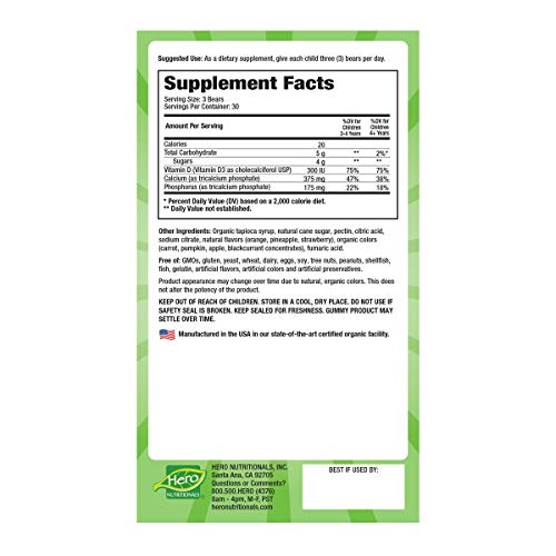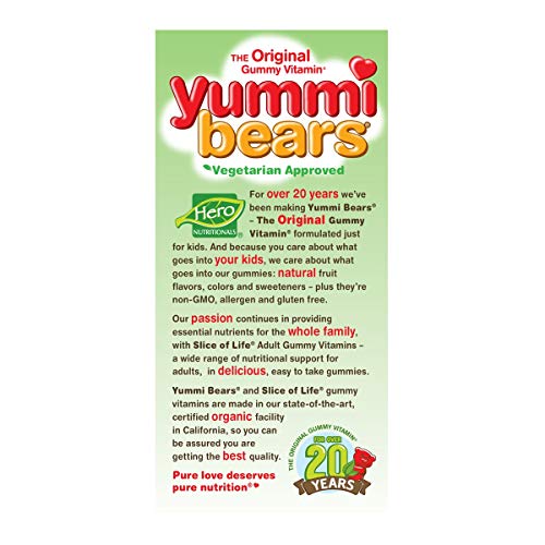 . Más información del producto Ampliar Leer más Free of allergens, gluten, dairy and soy. GMO free. Made with fruit pectin. Vegetarian approved. Daily Serving As a dietary supplement, parents may give each child up to three (3) bears per day. Supports bones, teeth, immune and heart healthy. Made with Vitamin D3 – the most absorbable form of Vitamin D. Delightfully yummi natural strawberry, orange and pineapple flavors. Leer más Ampliar Leer más . Descripción del producto Sabor:Vegetarian D3 El original Gummy vitamina Alérgenos última intervensión de lácteos, gluten, gelatina y? Desde 1997 Suplemento dietético Con sabores de fruta natural y colores De Huesos y dientes sanos Gummy vitamina para los niños Las Américas # 1 Childrens vitamina. Yummi Bears Vegetarian vitaminas son la solución perfecta para los niños que no les gusta llevar sus vitaminas. Los niños Love Our gran sabor y los padres que sus hijos reciban la pureza nutrición que se merecen en una forma non-gelatin. Yummi Bears calcio + Vitamina D3 es perfectamente blended a dar a los niños las vitaminas y minerales que necesitan para mantener fuerte huesos, dientes, sano y las encías. Hero Nutritionals se dedica a proporcionar la más alta calidad, todo natural vitaminas y minerales que ayudan a su niño obtener la nutrición que necesitan Everyday. Sistema nutricional completo Multi-Vitamin y mineral para completar bien equilibrada nutrición wholefood + antioxidantes contiene 15 concentrates de frutas y verduras vitamina C excelente fuente de vitamina C Calcio + Vitamina D para los huesos sanos y dientes de fibra para la salud digestiva y regularidad Echinacea + Vitamina C y zinc para un sistema inmune saludable childbright para saludable de concentración de fibra última intervensión Omega 3?6?9 para el desarrollo saludable del cerebro DHA para una visión y la función cerebral saludable Vitamina D3 aumenta la absorción de calcio para saludable huesos Unidad de venta: Cada Paquete: 1 Tamaño: 90 Count .