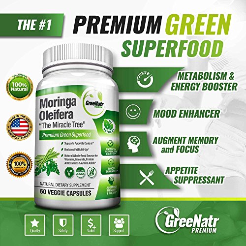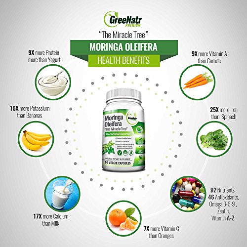 . Descripción del producto THE MIRACLE TREE Pure Moringa Oleifera Leaf Extract Capsules; the miracle multiple health pill for your body and mind. Supports weight management, balances sugar levels, reduces cravings, promotes healthy digestion, beautifies the skin and much more. It contains approximately 20 types of amino acids, 46 types of antioxidants, 36 anti-inflammatory compounds - It is a perfect source of bio-available vitamins and minerals like Vitamin A, B, B1, B2, B3, B6, C (Ascorbic Acid), E and Macro Minerals, Trace Minerals, Phyto nutrients. Moringa leaves are a good source of quality protein & dietary fiber. The miracle moringa tree offers an incomparable amount of natural benefits for your body and mind. Moringa Oleifera, also known in India and Pakistan as soanjhna; In Tamil Nadu, Moringa is known as Murungakkai; In the Philippines, moringa leaves, known as kamunggay, malunggay, kalunggay, or marungay. Just Two Tablets A Day One daily serving of this combination contains 1000 mg of Pure MOringa Oleifera Extract. 60 tablets should last one adult for 30 days. . .