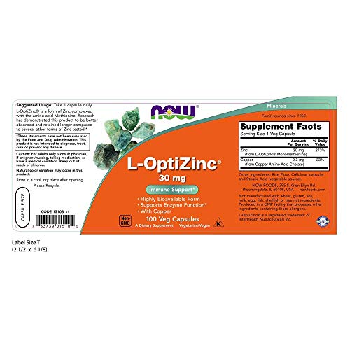 . . Descripción del producto Tamaño:100 Capsules Opti l-zinc de Now Foods es una forma especialmente formulado de zinc mezclado con el aminoácido metionina. Los estudios han demostrado que esta forma única de zinc tiene una tasa de absorción superior y se mantiene en el cuerpo más largo que regular de zinc. Mejorado con 300 mcg, cobre, Opti l-zinc puede ser útil un número de cosas incluyendo la mejora de la función inmune, corrigiendo las deficiencias y mucho más. .