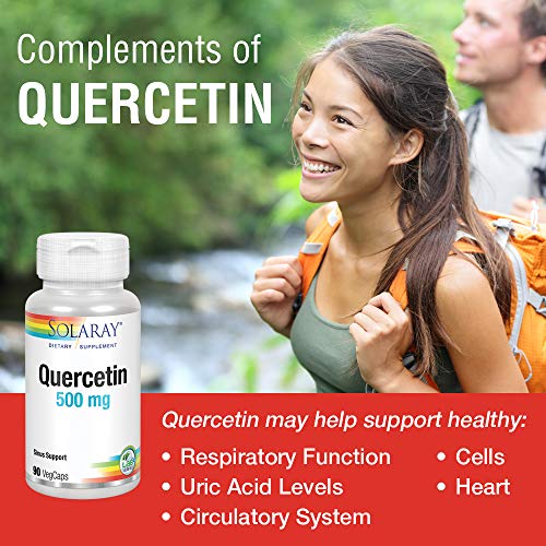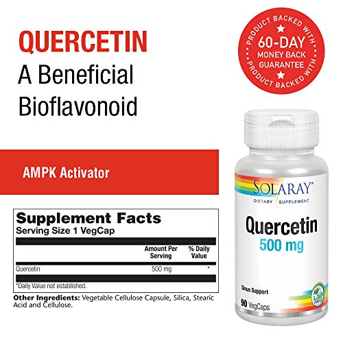 . Descripción del producto Quercetin: Bioflavonoids, Antioxidants, AMPK Activator Quercetin belongs to a family of compounds called bioflavonoids (responsible for the bright pigments in fruits and vegetables). At Solaray, we’re proud to offer a high-quality Quercetin supplement that may help provide numerous health benefits! Feel the difference of Solaray Quercetin 500mg! Bioflavonoids Quercetin belongs to a family of compounds called bioflavonoids that are responsible for the bright pigments in fruits and vegetables. Antioxidant Activity Quercetin has antioxidant properties and may help support healthy cells, heart, and circulatory system function. Uric Acid Support Considered an AMPK activator, this powerful compound may help maintain uric acid levels within a healthy range. Trusted Brand A brand you trust, Solaray Quercetin 500mg is manufactured in our own facility, non-GMO, vegan & lab verified to ensure quality. Leer más Why Quercetin? Quercetin belongs to a family of compounds called bioflavonoids (responsible for the bright pigments in fruits and vegetables). With antioxidant properties, Quercetin may also help provide nutritive support for healthy cells, heart, and circulatory system function. Furthermore, Quercetin may help provide nutritive support for healthy respiratory function by helping to support the modulation and release of histamine. Lastly, considered an AMPK activator, this powerful compound may help maintain uric acid levels within a healthy range – ideal support for those following a ketogenic diet or looking for joint health support. CellsHeartCirculatory SystemRespiratory FunctionUric Acid Support Why Solaray? In 1973, Solaray began to formulate herbal blends for specific health benefits. Over the years, Solaray pioneered many innovative products and has become a trusted full-line dietary supplement brand found in health food stores all around the world. True to our commitment to stay leading edge in powerful supplementation, we are proud to offer our Quercetin 500mg! Our vegan, non-GMO Quercetin supplement does not contain any artificial colors, flavors, or preservatives and is lab verified for identity, potency, and purity. Our quality is a difference that you can feel. Feel the difference of Solaray Quercetin 500mg! *These statements have not been evaluated by the FDA. This product is not intended to diagnose, treat, cure or prevent any disease. . .