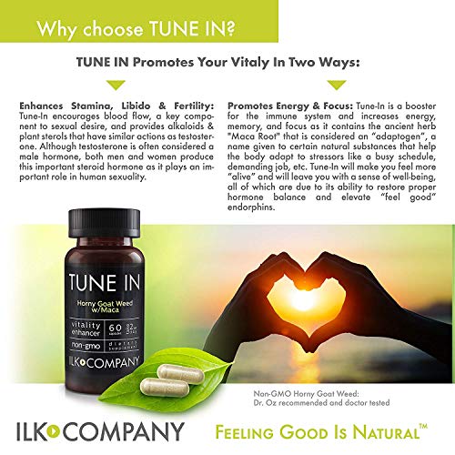 . . Descripción del producto "Tune-In" Herbal Libido Enhancer ofrece una combinación de hierbas antiguas que han sido utilizadas por mujeres y hombres en la tradición de hierbas chinas durante siglos: Epimedio Sagittatum Icariinas Polvo para raíces de Maca. Mucuna Pruriens Polvo de raíz Vulgare de polipodio. Tongkat Ali Root Powder Pólvora de sierra Palmetto Berry. Muira Puama - Polvo para raíces Arginina L Polvo de raíces Panax ginseng. "Tune-In" promueve tu vitalidad de dos maneras: 1) Mejora la estamina, libido y fertilidad: Tune-In estimula el flujo sanguíneo, un componente clave para el deseo sexual, y proporciona alcaloides y esteroles de plantas que tienen acciones similares a la testosterona. Aunque la testosterona se considera a menudo una hormona masculina, tanto hombres como mujeres producen esta importante hormona esteroidea, ya que desempeña un papel importante en la sexualidad humana. 2) Promueve la energía y el enfoque: Tune-In es un impulsor del sistema inmune y aumenta la energía, la memoria y el enfoque, ya que contiene la antigua hierba "Maca Root" que se considera un "adapttogen", un nombre dado a ciertas sustancias naturales que ayudan al cuerpo a adaptarse a los estrés como un ajetreado horario, exigente trabajo, etc. Tune-In te hará sentir más "vivo" y te dejará con un sentido de bienestar, todo ello debido a su capacidad para restaurar el equilibrio hormonal adecuado y elevar los endorfines "sentir bien". Mallas de cabra sin OMG: recomendado por el Dr. Oz y probado por el médico. ¿Listo para disfrutar de una vida más saludable, joven y feliz? ¡Haz clic en "Añadir a la cesta" ahora y experimenta el poder de Tune-In! .