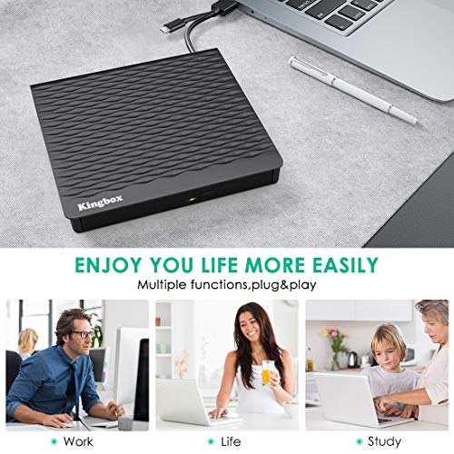 Kingbox - Unidad de DVD externa USB 3.0 Tipo C con doble puerto portátil, delgada, reproductor de DVD, transferencia de datos de alta velocidad, ideal para Mac OS Win7 Win8 Win10 Vista PC portátil.